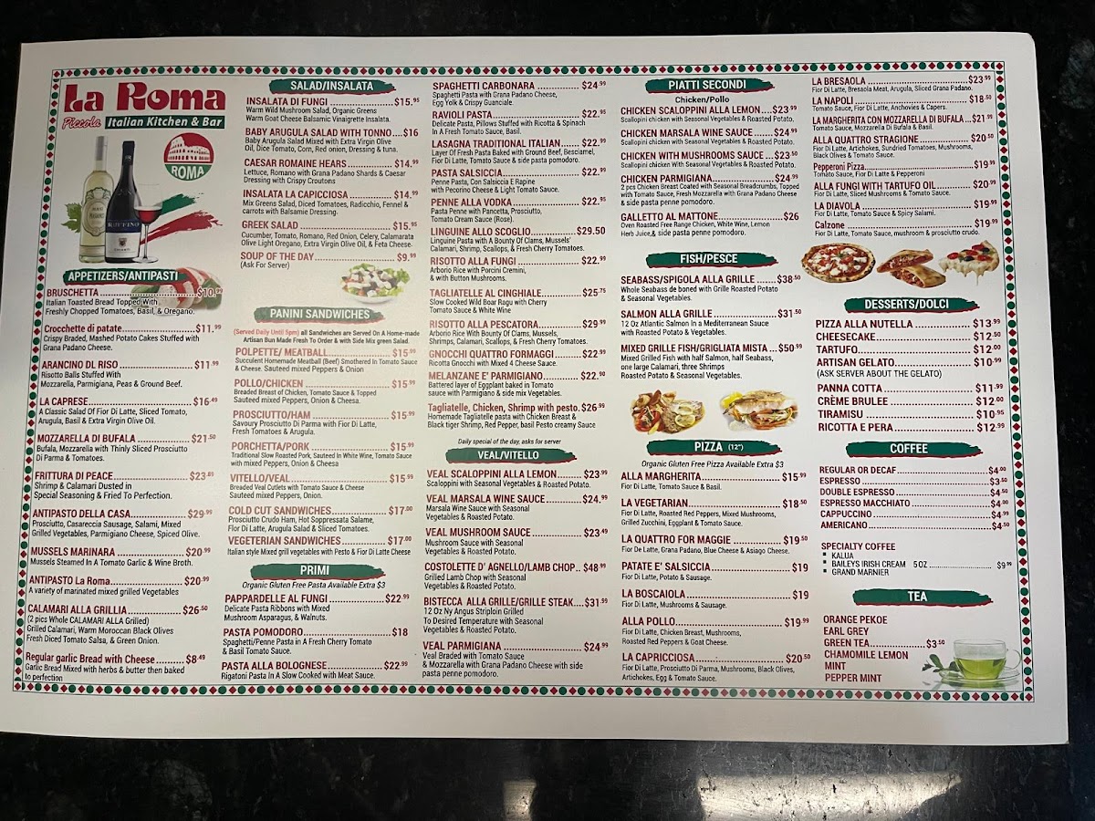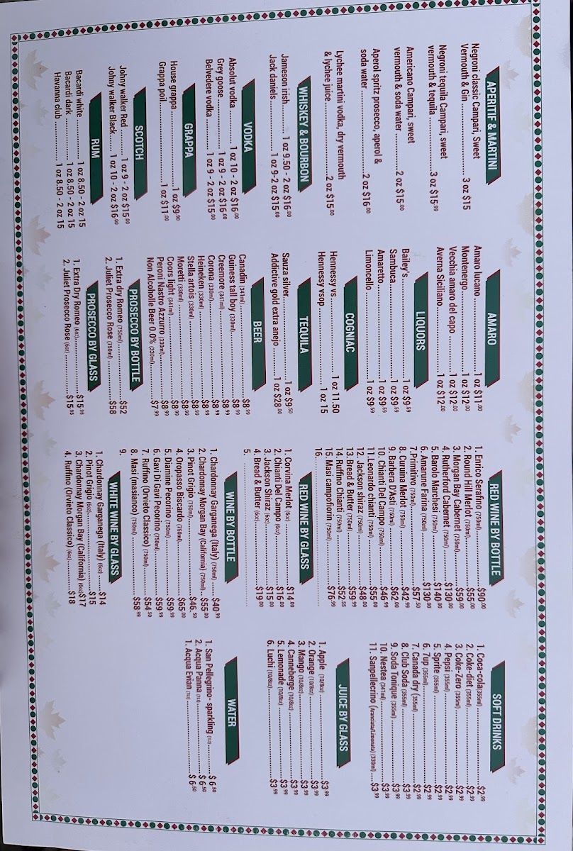 This structured menu supports both casual dining and more substantial meals, suitable primarily for lunch or dinner. Guests can expect to find traditional Italian pasta dishes, seafood, and pizza selections, catering to a range of tastes within these categories.